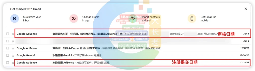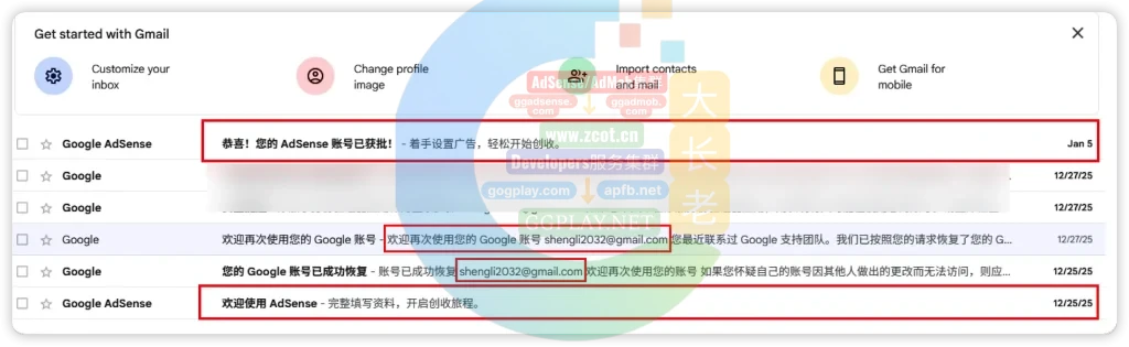 鉴于大长老在2025年秋冬季都针对AdSense过审问题做了实际探测与分享,因此2026年初也不会例外。2026年1月初Google集中审批了一些账号,如下图。